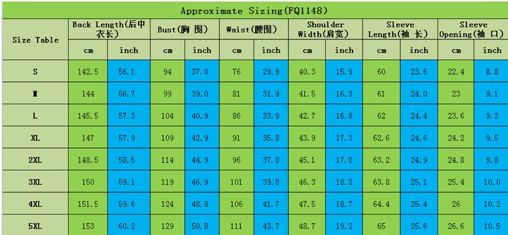 3XL:Shoulder 46 cm,Bust 119 cm,Waist 101 cm,Sleeve 65 cm,Length 150 cm